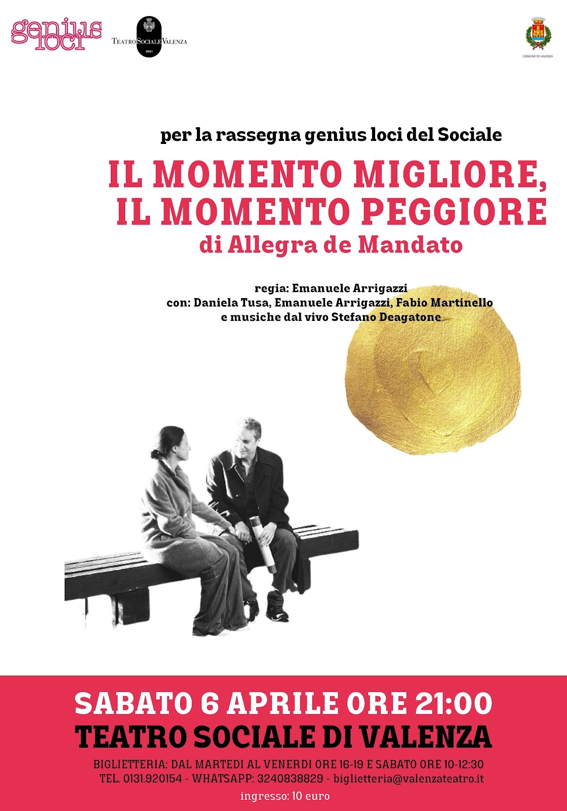 Il primo atto di questa nuova programmazione accoglie sabato 6 aprile (ore 21) la proposta di una compagnia composta da professionisti che si misura con il testo delicato ed intenso della giovane drammaturga Allegra de Mandato "Il momento migliore, il momento peggiore": commedia agrodolce che racconta alti e bassi di una coppia, in un cammino attraverso il tempo, nelle piccole e grandi "avventure" della quotidianità. Saranno in scena Daniela Tusa (insegnante del corso teatrale per adulti che si tiene al Sociale), Emanuele Arrigazzi e Fabio Martinello con gli interventi musicali alla chitarra di Stefano Deagatone.